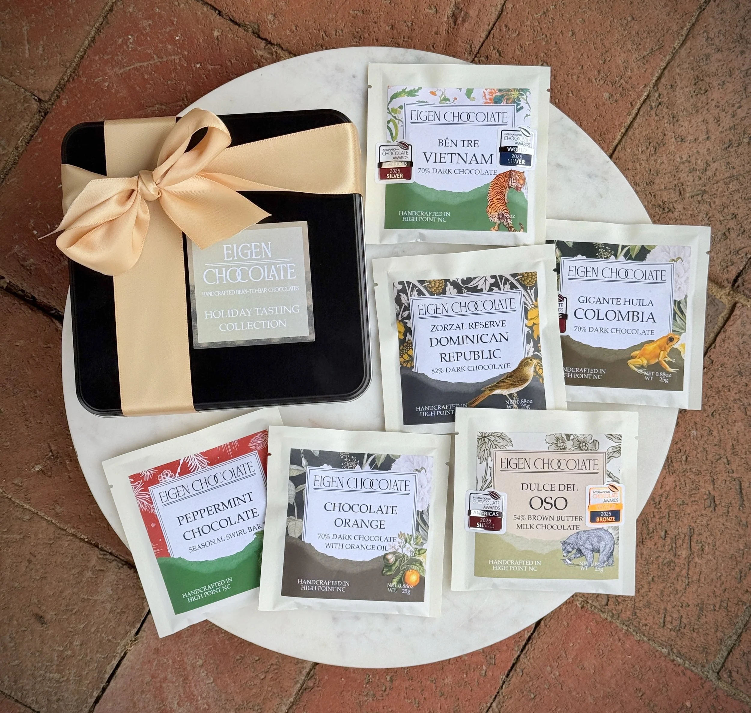 The following bars are included in this tin: 3 Dark Chocolate bars; 70% Ben Tre Vietnam, 82% Zorzal Reserve, Dominican Republic, 70% Gigante Huila, Colombia, 2 Holiday Flavors - 70% Dark Colombia Orangeand Peppermint Swirl and our 54% Dulce del Oso Brown Butter Milk Chocolate.
