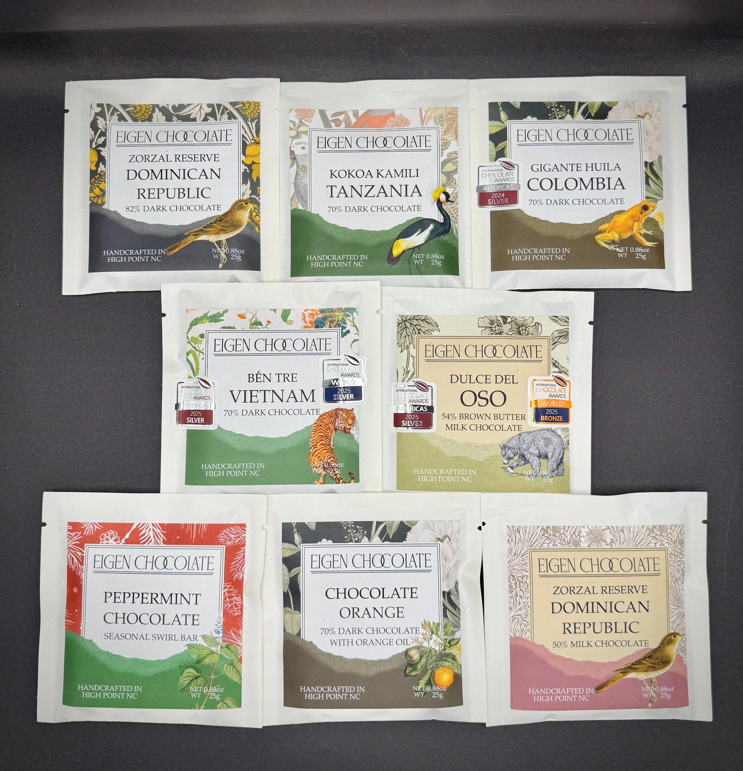 A little something for everyone, an assortment of 8 of our half sized bars: 4 dark chocolates, 2 seasonal chocolates and 2 milk chocolates.